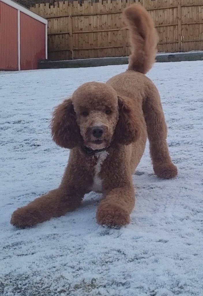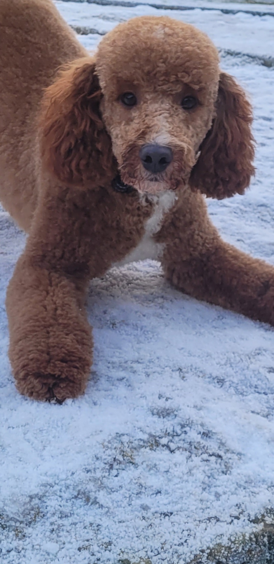 Max ist ein ruhiger, ausgeglichener Rüde und eine echte Bereicherung für jede Zucht. Er stammt aus Großpudel Linien und vererbt einen kräftigen Knochenbau. Ideal für die Zucht mittelgroßer Rassen. Da er ein wunderschönes kräftiges Dunkelrot hat, ist er ein wahrer Eyecatcher und wertvoll für die Zucht roter Hunde. Er trägt kein Braun, sodass das Rot in der Nachzucht sehr schön erhalten bleibt. Er trägt Scheckung (S-Lokus), sodass auch er für die Zucht mit vielen Weiß-Abzeichen oder für die Scheckung-Zucht eine Bereicherung ist.